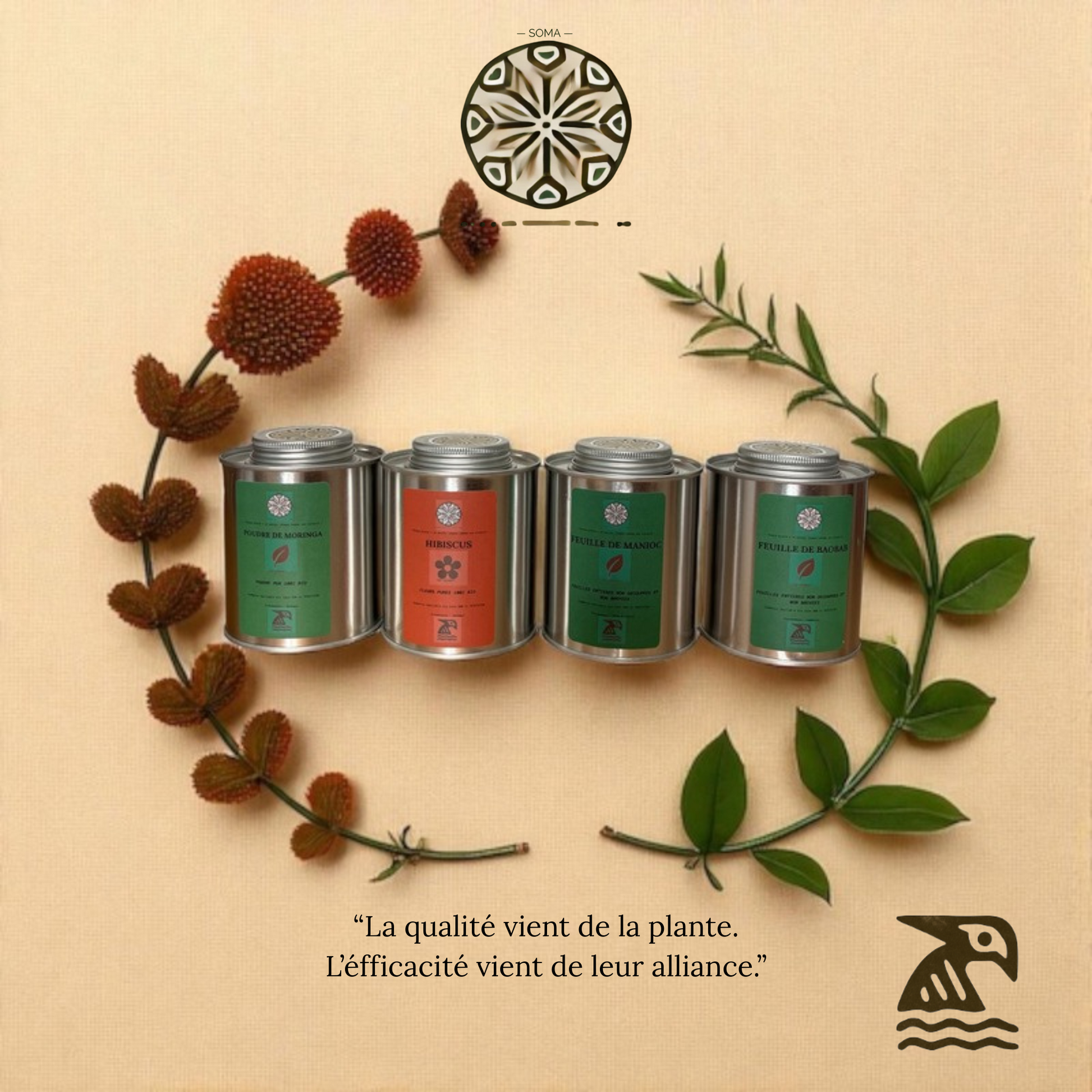 - Moringa (feuilles séchées) – “L’arbre de vie” : Riche en fer, vitamine C, calcium, protéines et magnésium, le Moringa est traditionnellement utilisé pour stimuler la production des globules rouges, fortifier l’organisme en période de fatigue, et soutenir le système immunitaire. Il est également reconnu pour ses propriétés anti-inflammatoires naturelles.