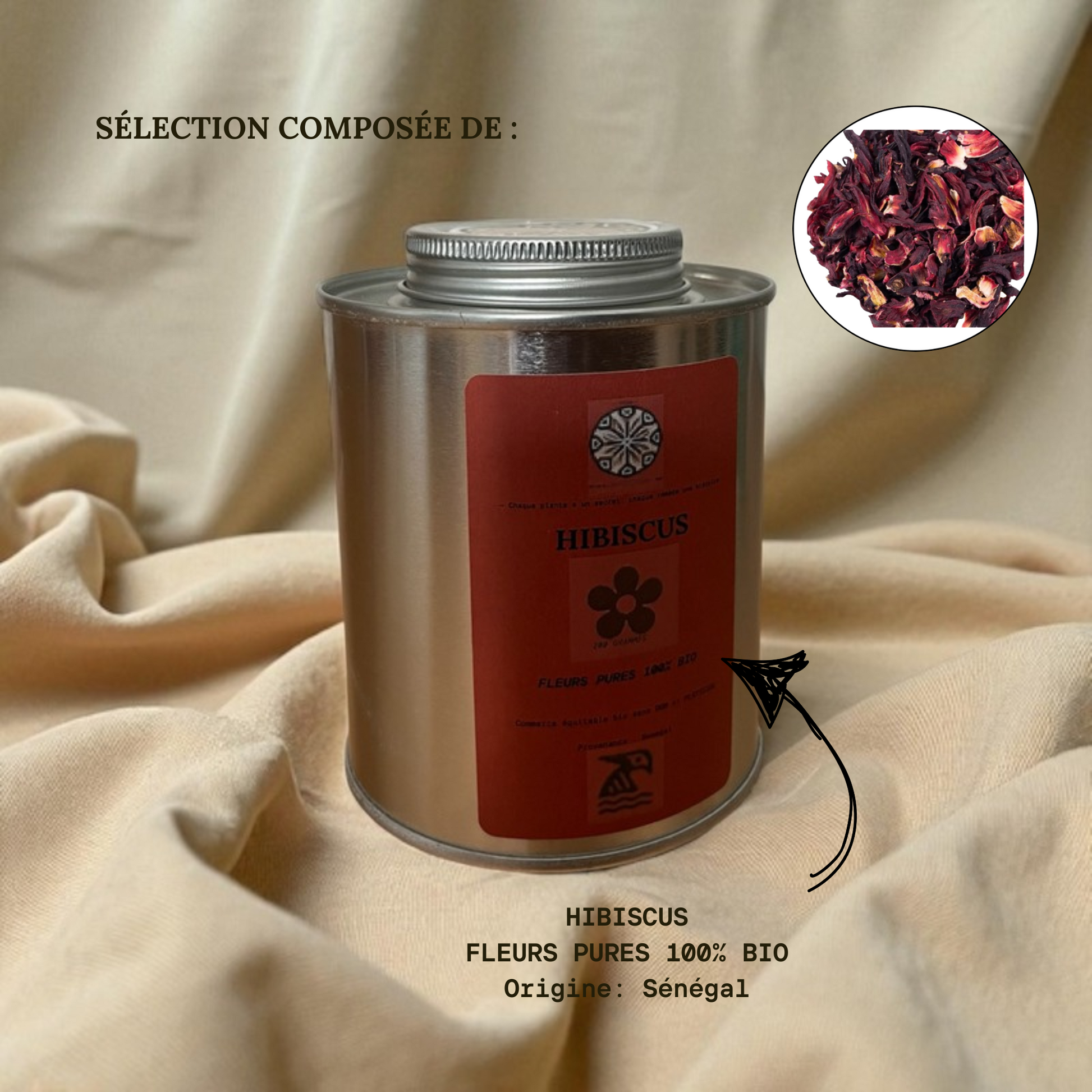 - Bissap rouge (Hibiscus sabdariffa) – Calyces séchés : Cette plante est une excellente source d’antioxydants, de fer, de vitamines C et d’acides organiques. Elle est traditionnellement utilisée pour tonifier le sang, aider à lutter contre l’anémie, stimuler la digestion et favoriser une bonne circulation sanguine. Elle peut aussi contribuer à maintenir une tension artérielle normale.